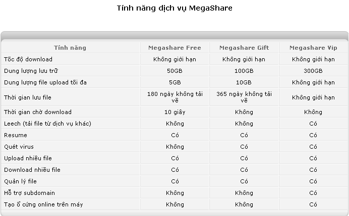 Và mới đây MegaVNN đã cung cấp dịch vụ MegaShare với những thông số thực sự làm nức lòng người dùng.