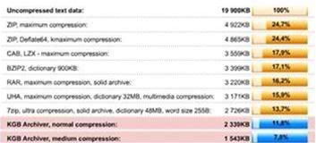 3. Đấy là bảng tóm tắt tỉ lệ nén trung bình giữa các chương trình nén với KGB. Mới đây cá biệt có người dùng chương trình này để nén bản cài đặt bản rút gọn của Office 12 trên DVD dung lượng 450 MB thành file 1,47 MB (tỉ lệ nén gầnkhoảng 99%). Đó là một file nén bằng KGB cao nhất có được từ trước tới nay. Tôi đã thử nghiệm qua: bung nén thành công mỹ mãn, có điều hơi lâu (mất ít nhất 8 tiếng đồng hồ), nhưng làm offline nên chả sao!