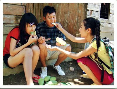 Chưa hết đâu, những cô gái thì "được" treo mình trên những vách đá dựng đứng cao gần 500 mét. Diễn viên teen Mỹ Kim (vai An) học võ từ bé nên được đạo diễn Như Ngọc hoàn toàn yên tâm vào tài leo núi của cô nàng. Không ngờ, leo đến giữa vách đá, Mỹ Kim tự dưng nhìn xuống dưới rồi không dám leo tiếp nữa. Mẹ Kim đứng bên dưới, xót con gái nên không ngăn được nước mắt. Kim sợ quá cũng khóc theo mẹ. Cả đoàn phim đành phải chờ hai mẹ con bình tĩnh trở lại mới bắt loa tay động viên cô nàng: "đừng nhìn xuống, chỉ nhìn ngang, nhìn lên cao thôi, tiến lên, tiến lên"